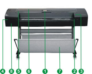 2. Slot frontal para alimentação de folha solta de mídias de largura até 609 mm (modelo de 24") ou até 1117 mm (modelo de 44")